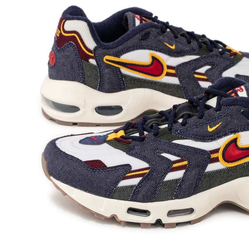 The Nike Air Max 96 II QS Blackened Blue sneakers are a new-season must-have. Made with a white underlayer, the pair boasts a dynamic and sturdy silhouette featuring thick, embroidery-accented strips, retro-stylized tongue branding, denim fabric details and a varsity-style Swoosh logo.